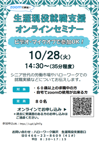 シニア世代の労働市場やハローワーク(特にハローワーク藤沢)での就職実績などについて30~40分程度でお伝えします。お気軽にご参加ください。