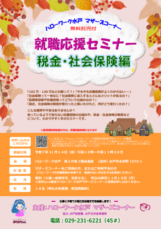 説明会名 【集合型開催:託児付】ハローワーク水戸マザーズコーナー就職応援セミナー 税金・社会保険編