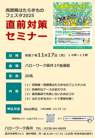 | 説明会名 | 西置賜はたらきものフェスタ2025直前対策セミナー |