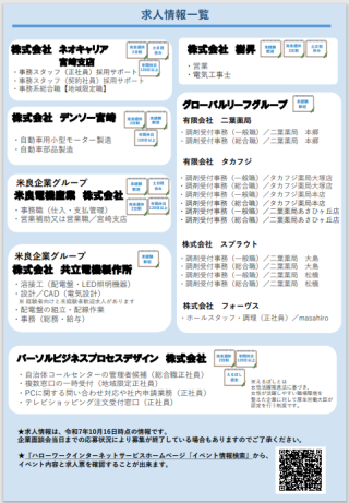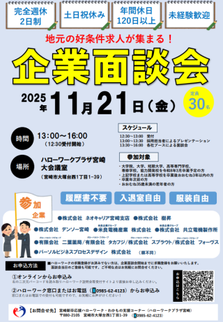 説明会名 | 11月21日開催~企業面談会~【おおむね35歳未満の方(新卒応援ハローワーク支援対象の方含む)対象】 |