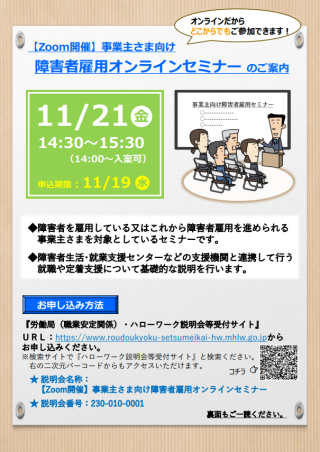 | 説明会名 | 【Zoom開催】事業主さま向け障害者雇用オンラインセミナー |