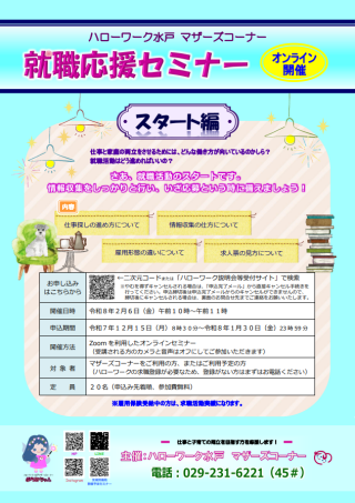 | 説明会名 | 【オンライン開催】ハローワーク水戸マザーズコーナー就職応援セミナー スタート編 |