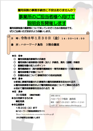 | 説明会名 | 新規雇用保険適用事業所及び新任事務担当者を対象とした事務手続き説明会 |