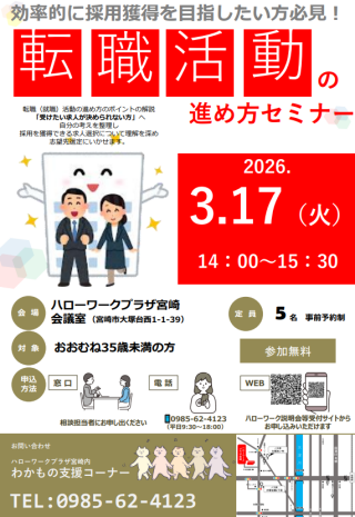 | 会場 | ハローワークプラザ宮崎 会議室 〒880-2105 宮崎県宮崎市大塚台西1丁目1-39 |