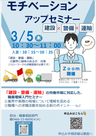 | 説明会名 | 3/5モチベーションアップセミナー(建設・警備・運輸分野) |