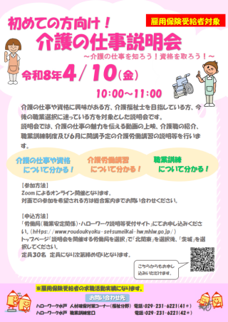 雇用保険受給者を対象とした、令和8年6月に開講予定の職業訓練(介護労働講習)や介護の仕事に関する説明会です。