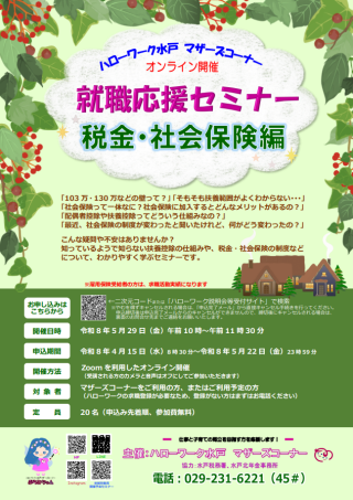 | 説明会名 | 【オンライン開催】ハローワーク水戸マザーズコーナー就職応援セミナー 税金・社会保険編 |