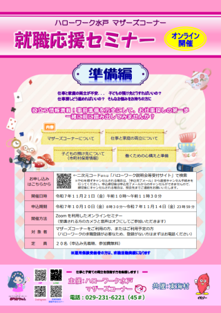 説明会名 | 【オンライン開催】ハローワーク水戸マザーズコーナー就職応援セミナー 準備編(東海村共催) |